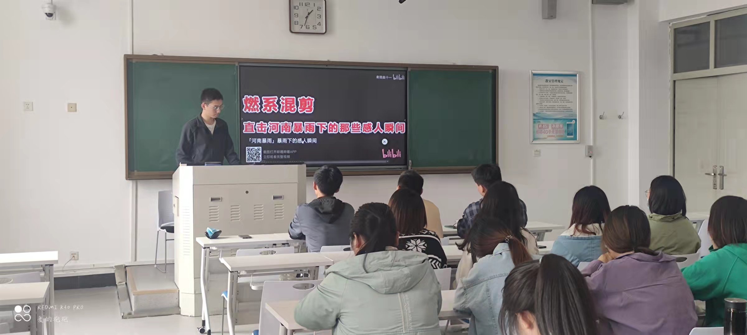 活动伊始,20级文化产业管理一班团支书邱骞同学通过视频展示的方式带领同学们了解郑州“7.20”洪灾,邱骞同学就洪灾发生的原因、过程以及灾后的重建进行了详细的介绍。同时还提到了在洪灾中不畏危险、挺身而出的志愿者和救援队以及那些主动捐款的明星和民众。而身为大学生的我们应该学习志愿者、救援队挺身而出的精神,做一名具有时代责任感的大学生。