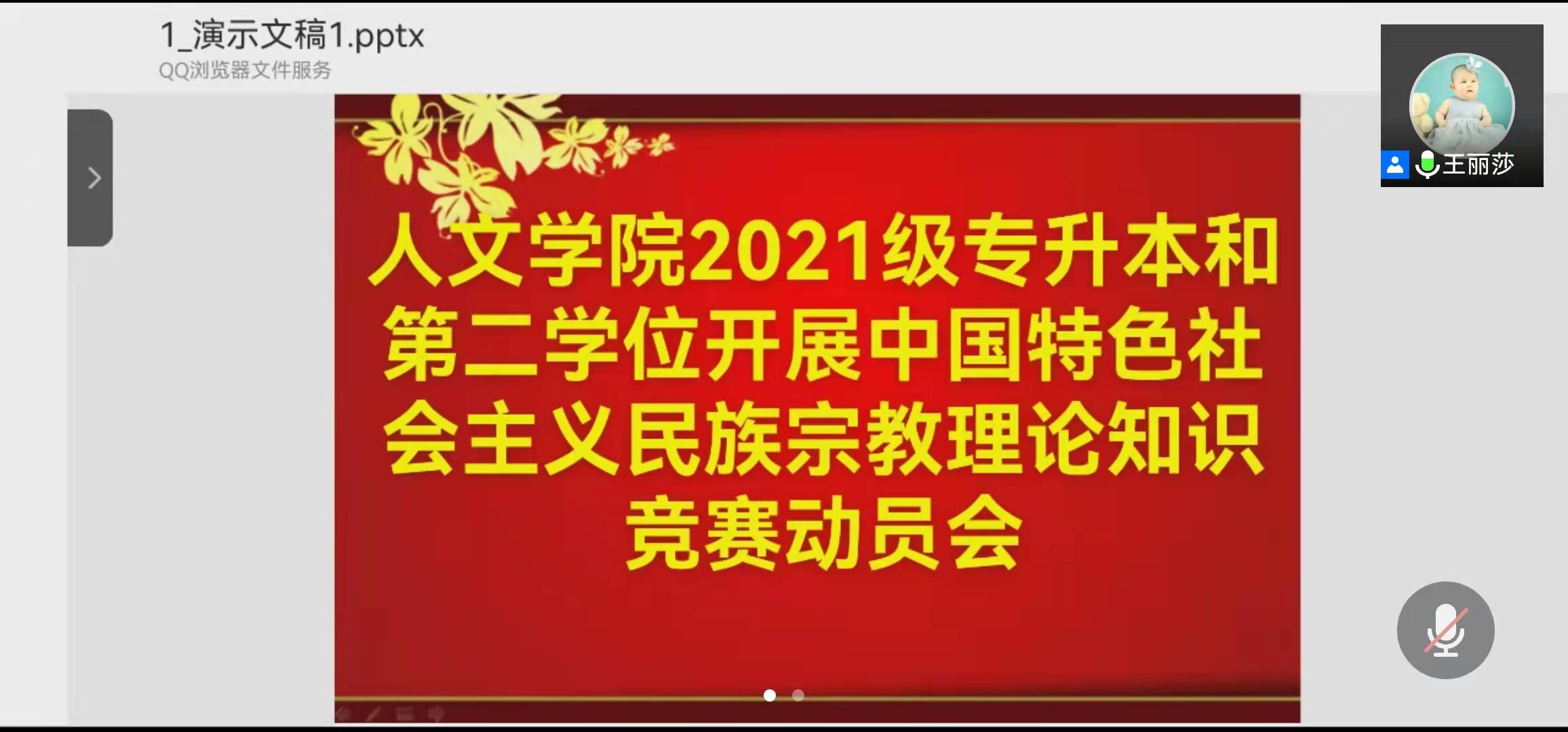 11月17日下午,今年会官网2021级专升本和第二学位在线上召开中国特色社会主义民族宗教理论知识竞赛动员会。2021级专升本和第二学位全体学生参加了会议。会议由辅导员王丽莎主持。