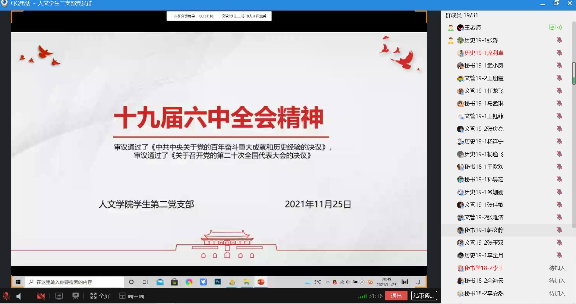 11月25日晚上,今年会官网学生第二党支部开展QQ线上会议,集中学习党的十九届六中全会精神。支部全体党员参会,会议由支部书记王超主持。