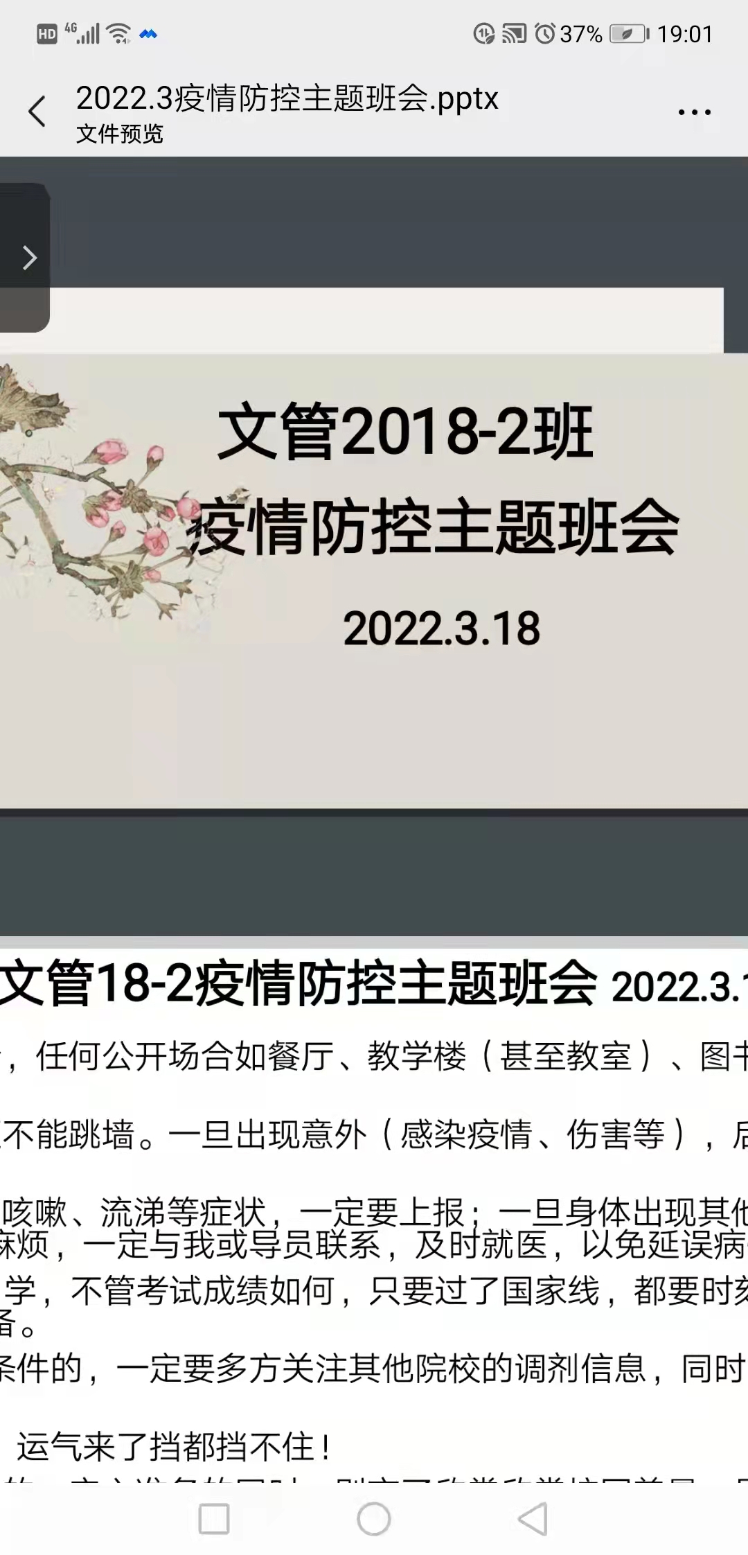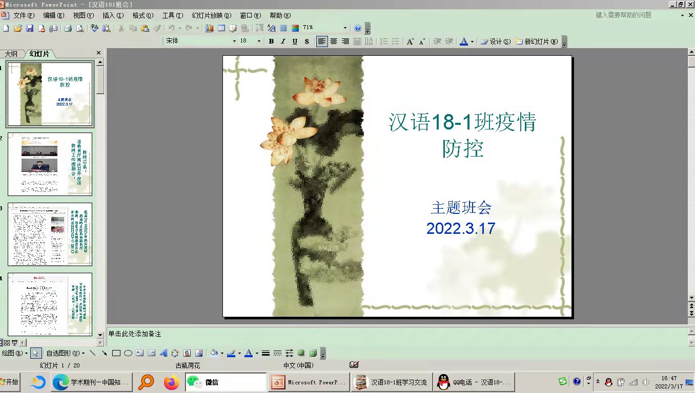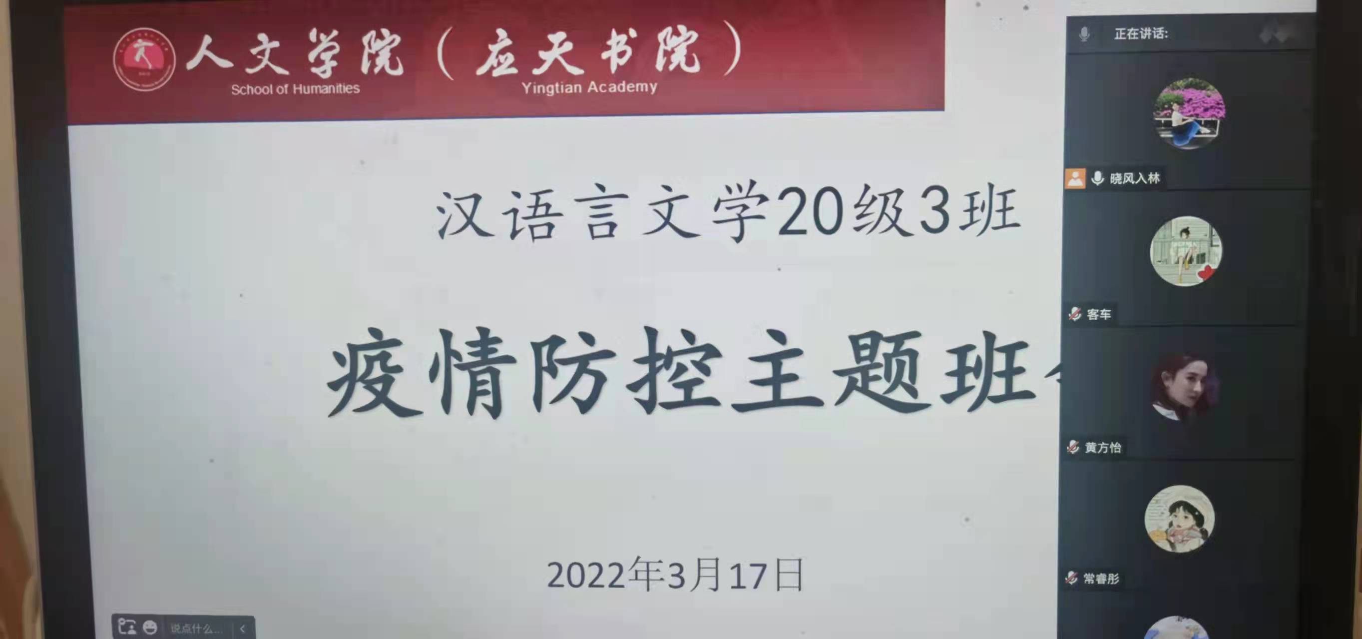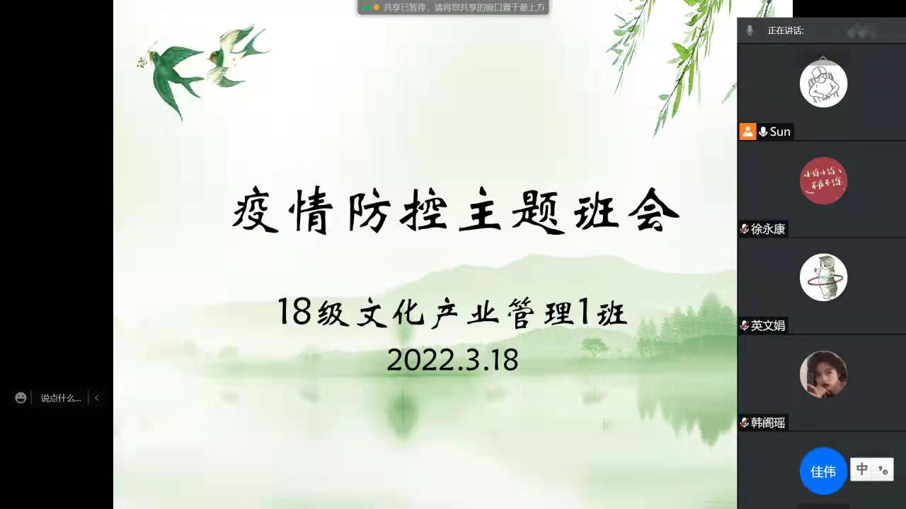 为进一步压实学生疫情防控意识,营造安全稳定的校园环境,今年会官网党委于2022年3月16日--18日,组织各班班主任分别召开了线上线下疫情防控主题班会。