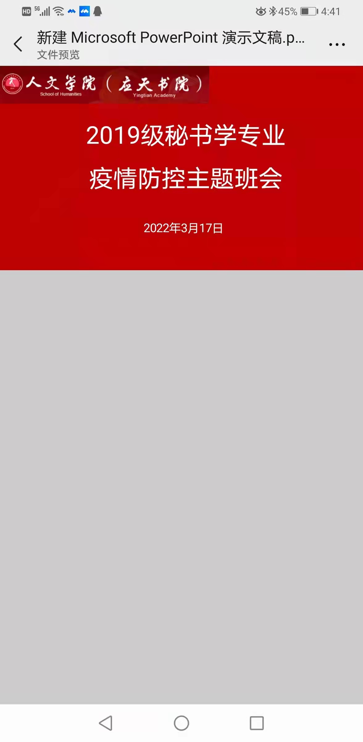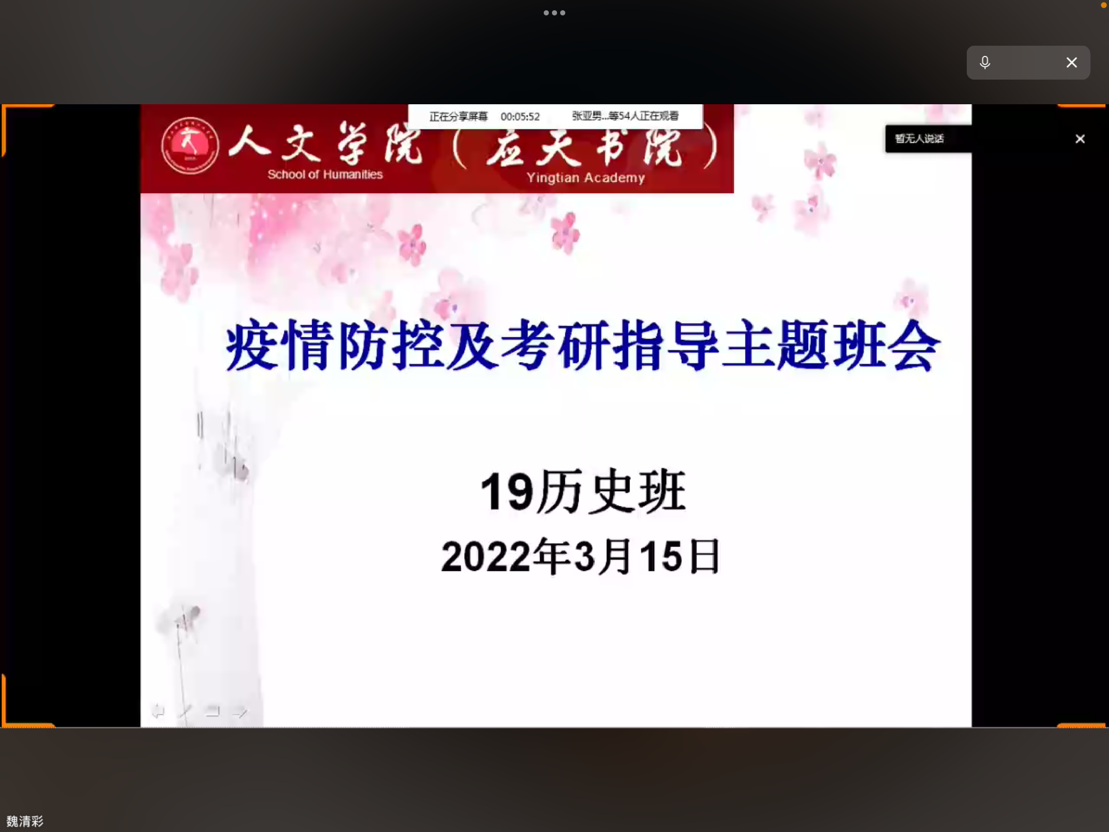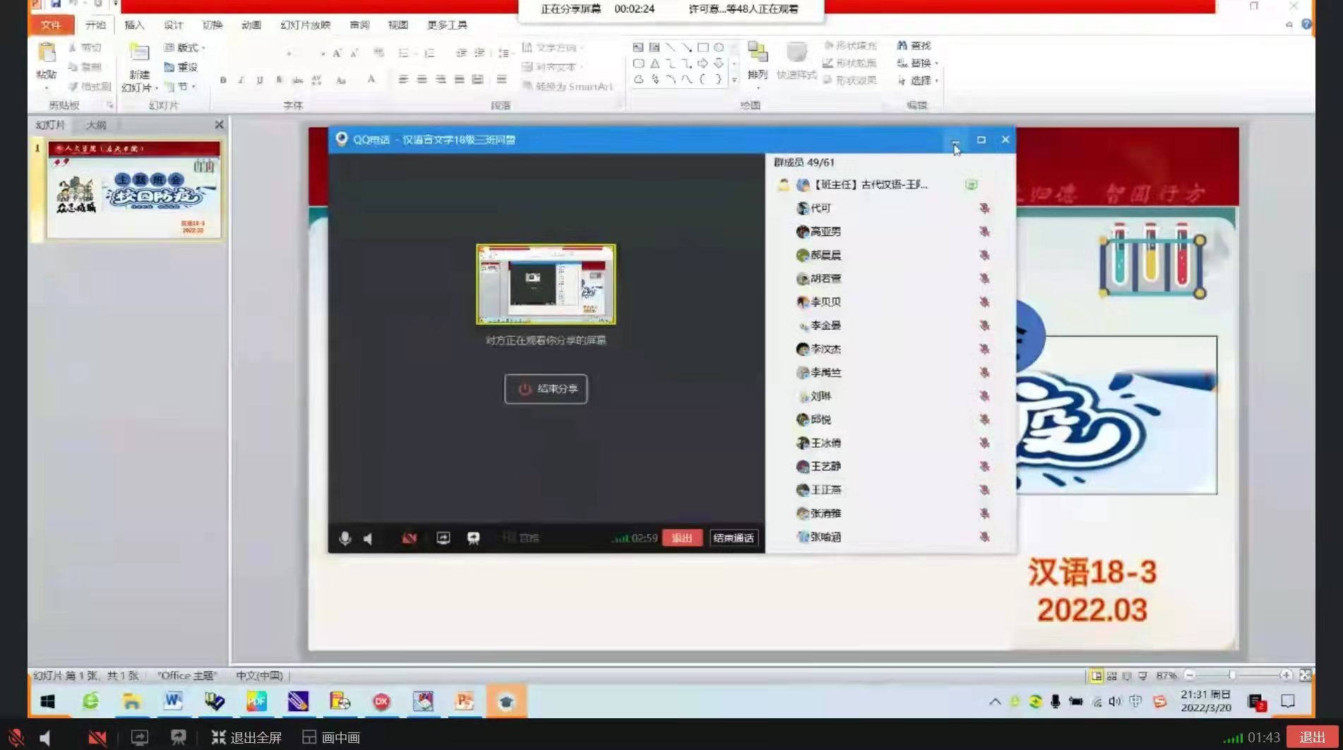 为进一步压实学生疫情防控意识,营造安全稳定的校园环境,今年会官网党委于2022年3月16日--18日,组织各班班主任分别召开了线上线下疫情防控主题班会。