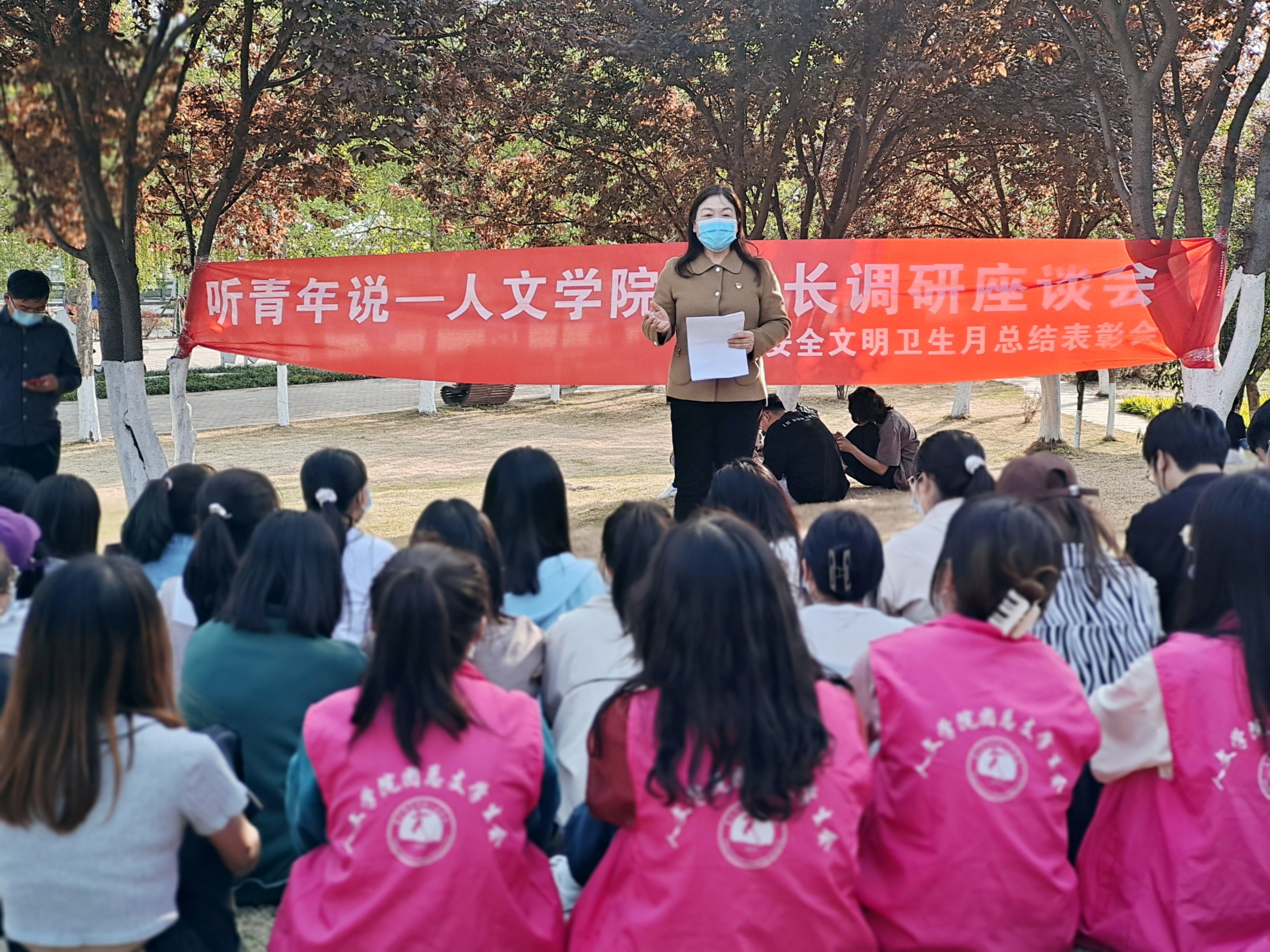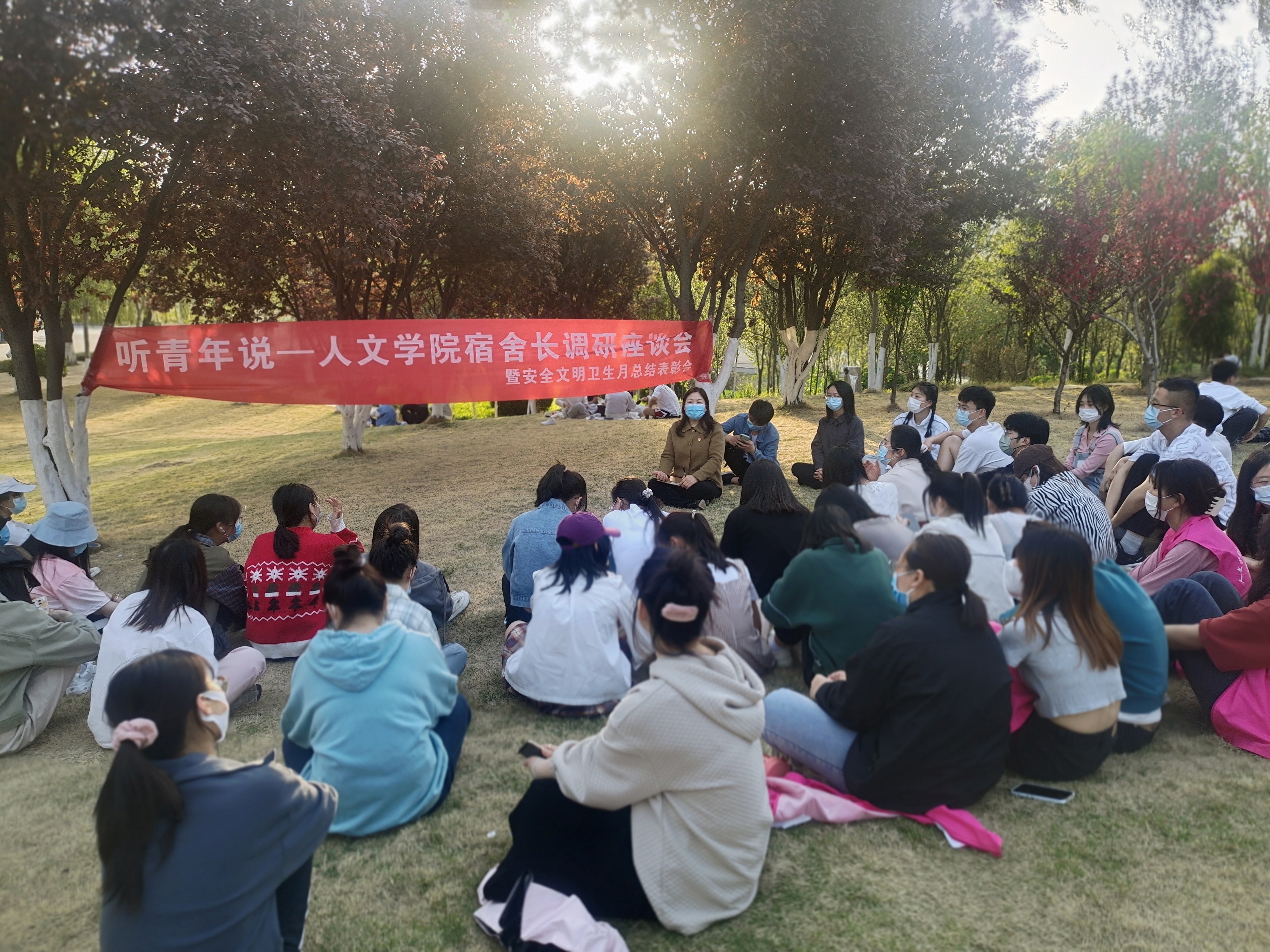 4月8日下午,今年会官网在梁园校区文秀山举行“听青年说”宿舍长调研座谈会暨安全文明卫生月表彰活动。今年会官网党委书记陈晓明、团委书记李红、值班留守辅导员、宿舍长代表和学生先进个人参加。