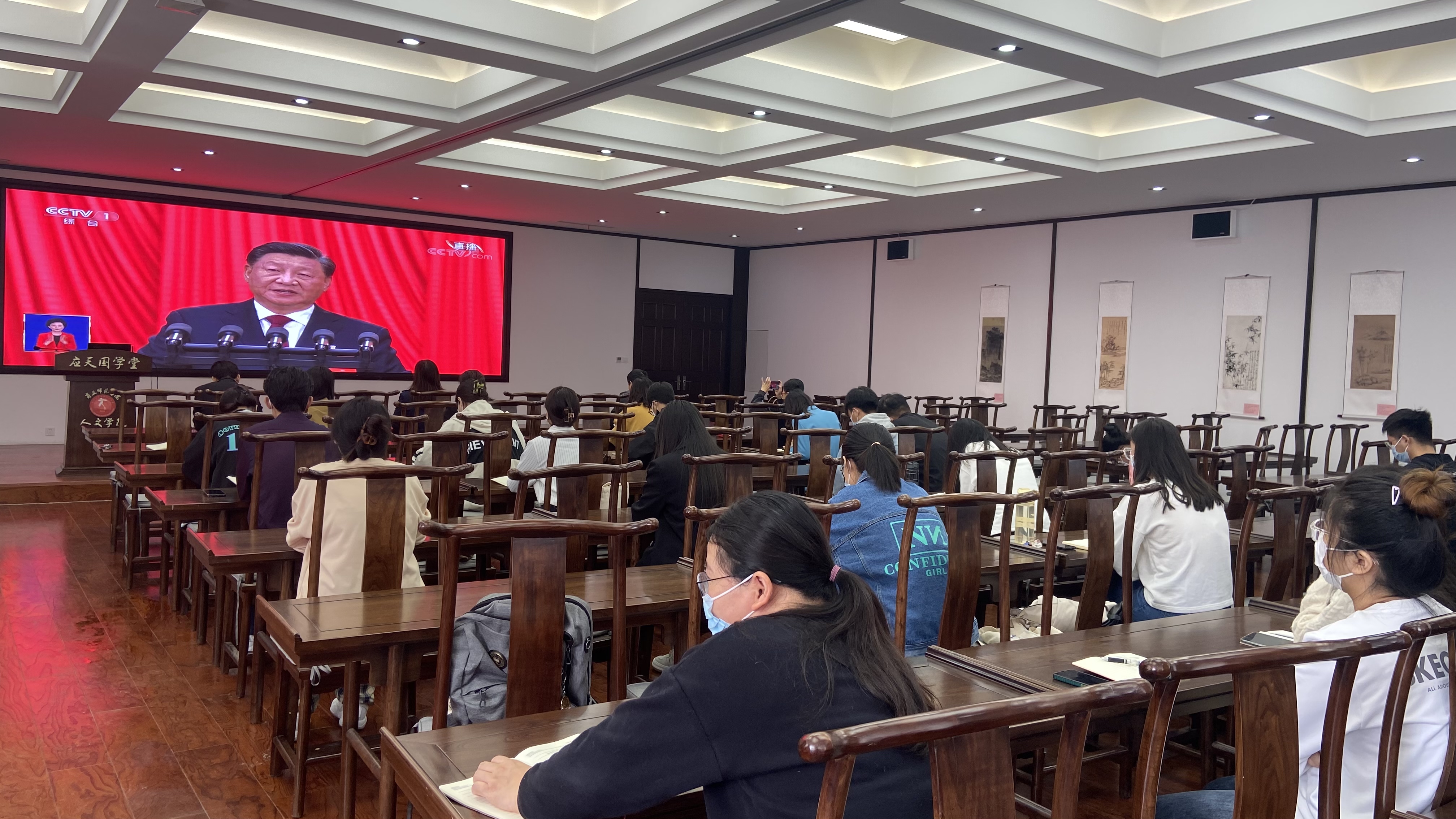 中国共产党第二十次全国代表大会是在全党全国各族人民迈上全面建设社会主义现代化国家新征程、向第二个百年奋斗目标进军的关键时刻召开的一次十分重要的大会。广大师生怀着激动而喜悦的心情,专注认真地聆听习近平总书记的报告。大家边看边做记录,收看现场不时响起热烈掌声。