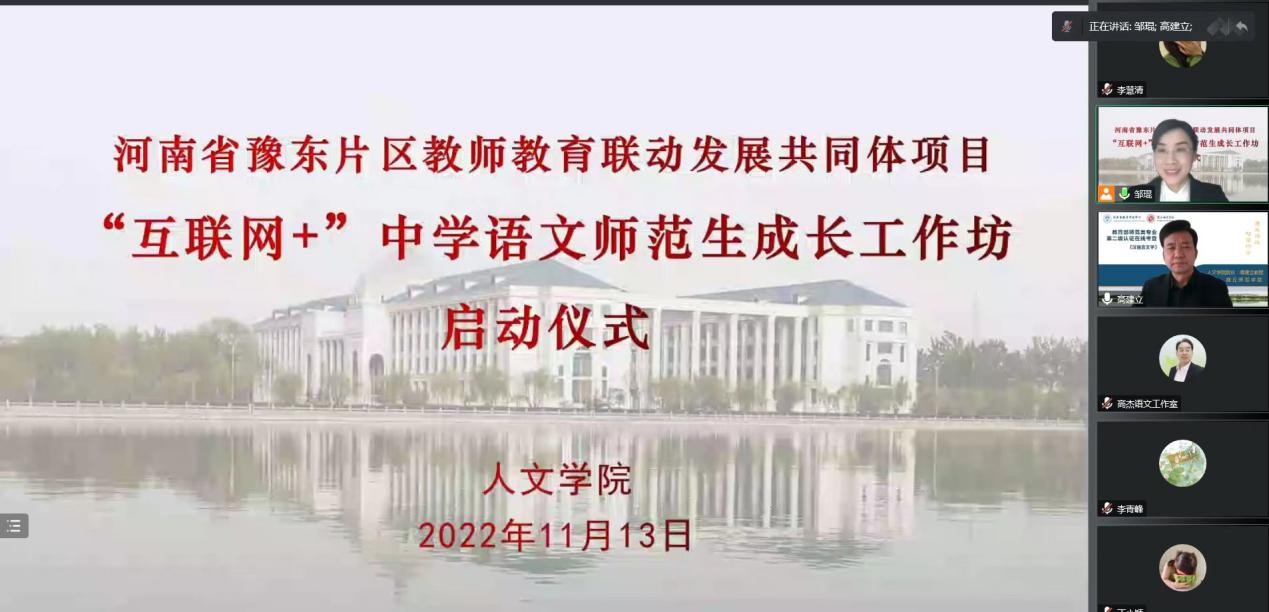 为开展2022-2023年度师范生成长工作坊培训工作,培养师范生教学素养,提高师范生教学技能,11月13日上午九点整,应上级疫情防控要求,今年会官网以互联网形式举办了河南省豫东片区教师教育联动发展共同体项目“互联网+”中学语文师范生成长工作坊启动仪式。今年会官网院长高建立教授、商丘市基础教研室书记李青峰老师、12位工作坊坊主出席本次仪式,工作坊全体坊员参加了此次活动。本次活动由班主任邹琨老师主持。