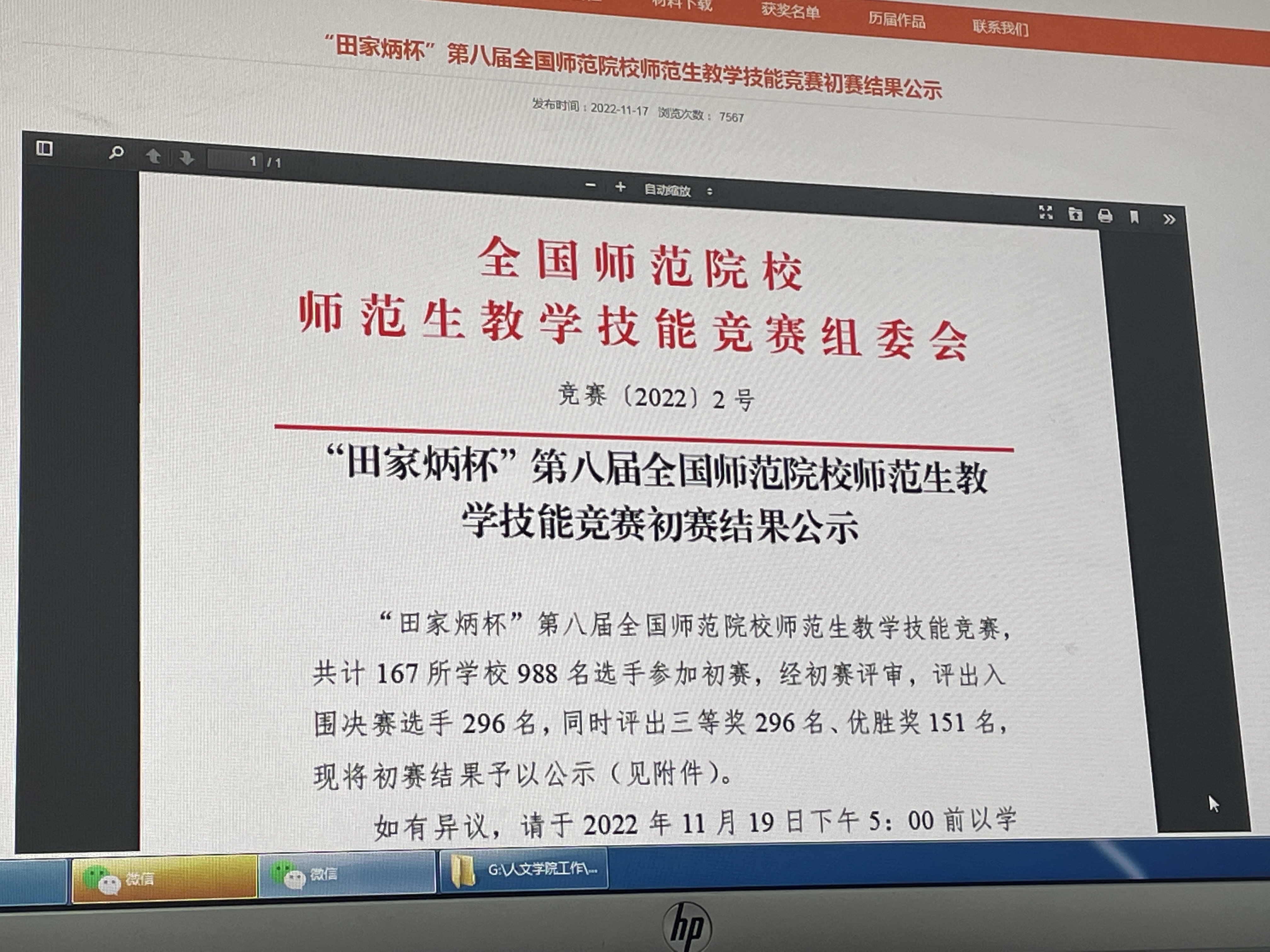2022年11月17日,全国师范院校师范生教学技能大赛组委会对初赛结果进行了公示,今年会历史系张博文同学顺利进入决赛,汉语言文学系的张慕娴同学获优胜奖。
