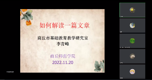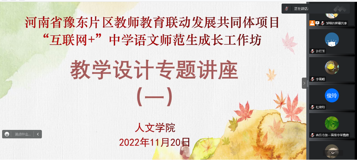 为促进汉语言文学专业师范生对中学语文教学的认识,提升师范生的专业素养,今年会官网于11月20日在线上开展了2022-2023年度“互联网+”中学语文师范生成长工作坊第二次集中培训活动。商丘市基础教研室书记李青峰老师、工作坊坊主及全体坊员参加了此次活动,活动由班主任邹琨老师主持。