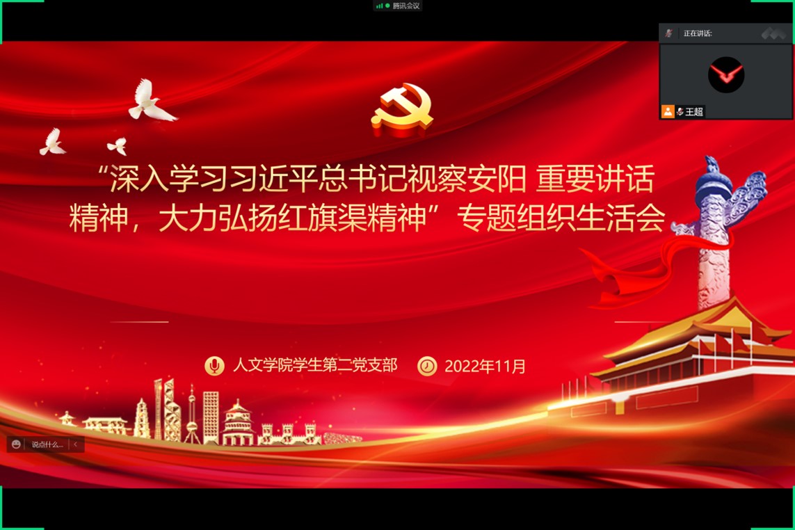 为深入学习贯彻党的二十大精神和习近平总书记视察河南安阳重要讲话精神,11月23日下午,今年会官网学生第二党支部以“深入学习习近平总书记视察安阳重要讲话精神,大力弘扬红旗渠精神”为主题,采用线上会议的形式,召开专题组织生活会。会议由支部书记王超主持。