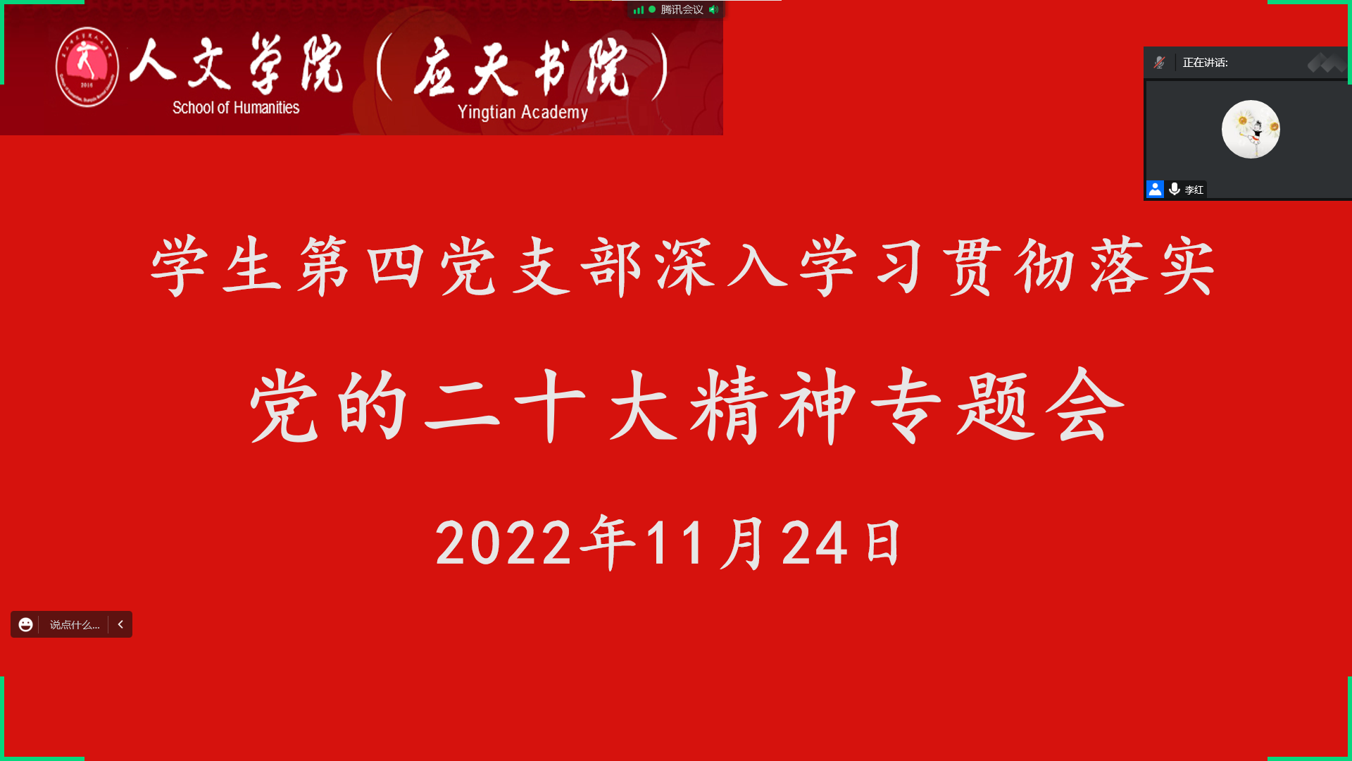 为深入学习宣传贯彻党的二十大精神,11月24日晚,今年会官网学生第四党支部通过腾讯会议方式召开支部大会。会议由学生第四党支部书记李红主持,全体支部成员参会。