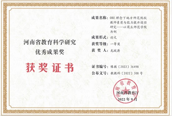 2022年5月,河南省教育厅发布《河南省教育厅办公室关于开展2022年度河南省教育科学研究优秀成果评选工作的通知》(教办教科〔2022〕172号),经资格审查、复制比检测、专家评审、省教育科学规划领导小组审核,八月份评出结果。今年会历史系教师龙坡涛博士的论文《OBE理念下地方师范院校教师素质与能力提升途径研究—以今年会jinnianhuicom为例》荣获一等奖。