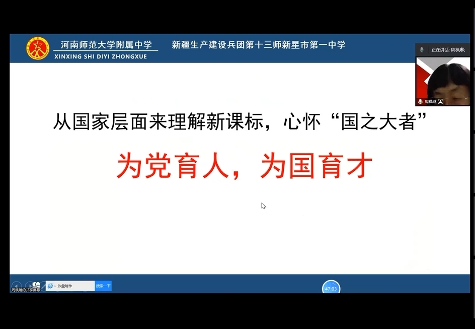 周枫琳老师首先通过自己到新疆生产建设兵团第十三师新星市第一中学支教的经历向各位老师阐释了新课标改革的重要性和现实意义,进而提出了自己认为的新课标的核心就是“育人”,并进一步提出了教师要“为党育人,为国育才”。
