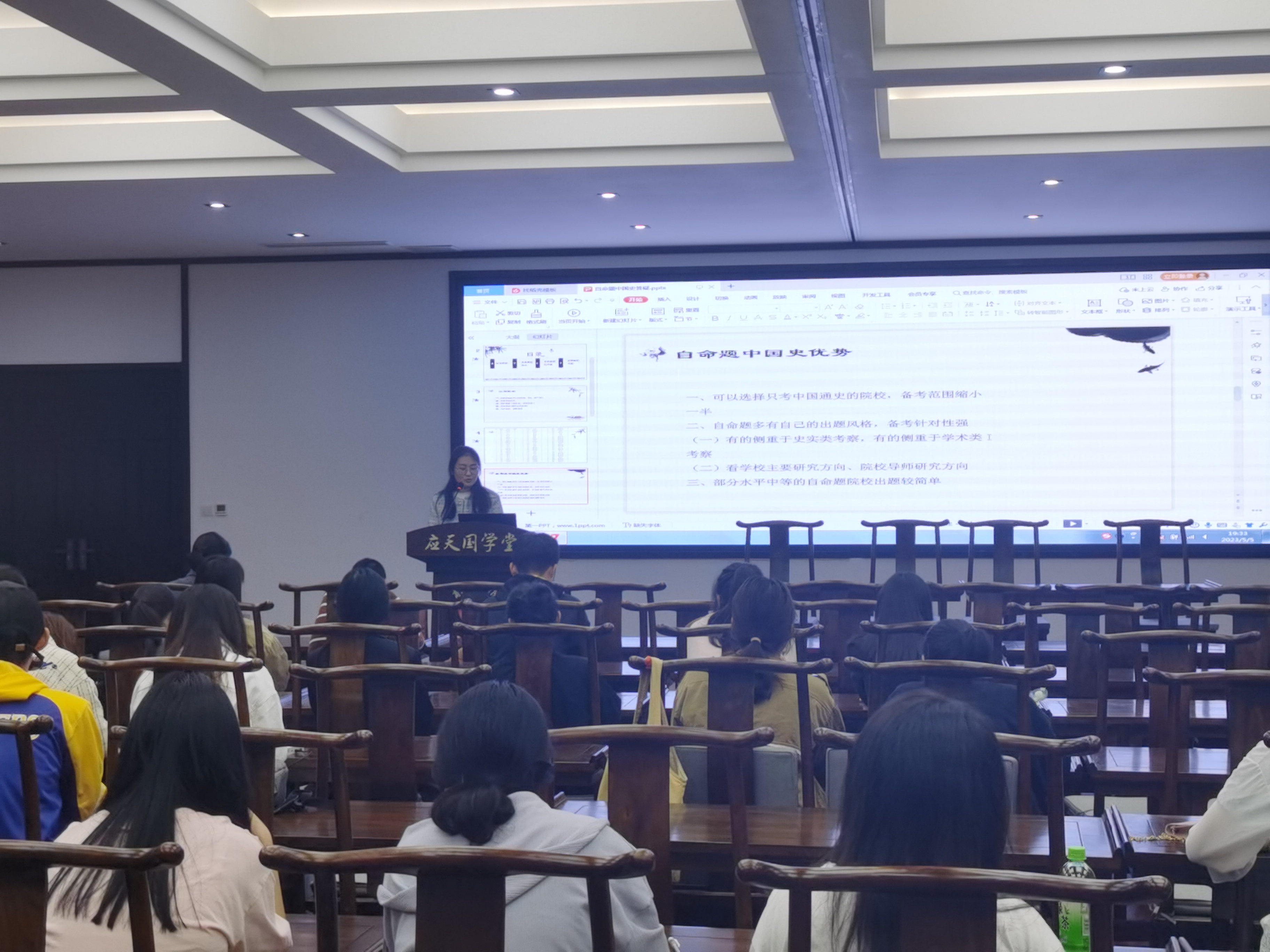 会议伊始,历史系主任薛立芳老师做动员发言,介绍了本次活动的背景及流程,公布了学院2019级学生的考研结果,并对他们取得的优异成绩表示祝贺,鼓励在座各位同学敢想敢做,再创佳绩。随后,成功上岸的尚嘉宁、王悦、王丙宜、刘雪洁、张淼、李金月等学姐们以PPT的形式,结合自身考研经历,围绕专业和院校选择、复习计划制定、各学科备考方向、心态调整等方面分享了各自的体验和感受,对备考过程中遇到的难题以及解决方式向学弟学妹们提出了宝贵的建议。于志刚老师和杨金华老师也提出了自己的建议,让意向考研的同学们对考研有了更深刻、更全面的了解。