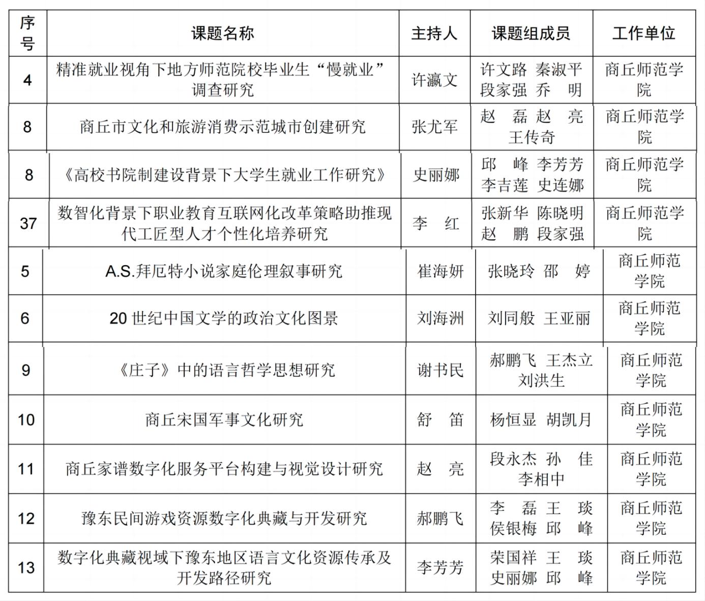 近日,商丘市哲学社会科学规划办公布了2023年度商丘市哲学社会科学规划立项课题名单。今年会许瀛文、张尤军、史丽娜、李红、崔海妍、刘海洲、谢书民、舒笛、赵亮、郝鹏飞、李芳芳11位教师申报的课题获批立项。