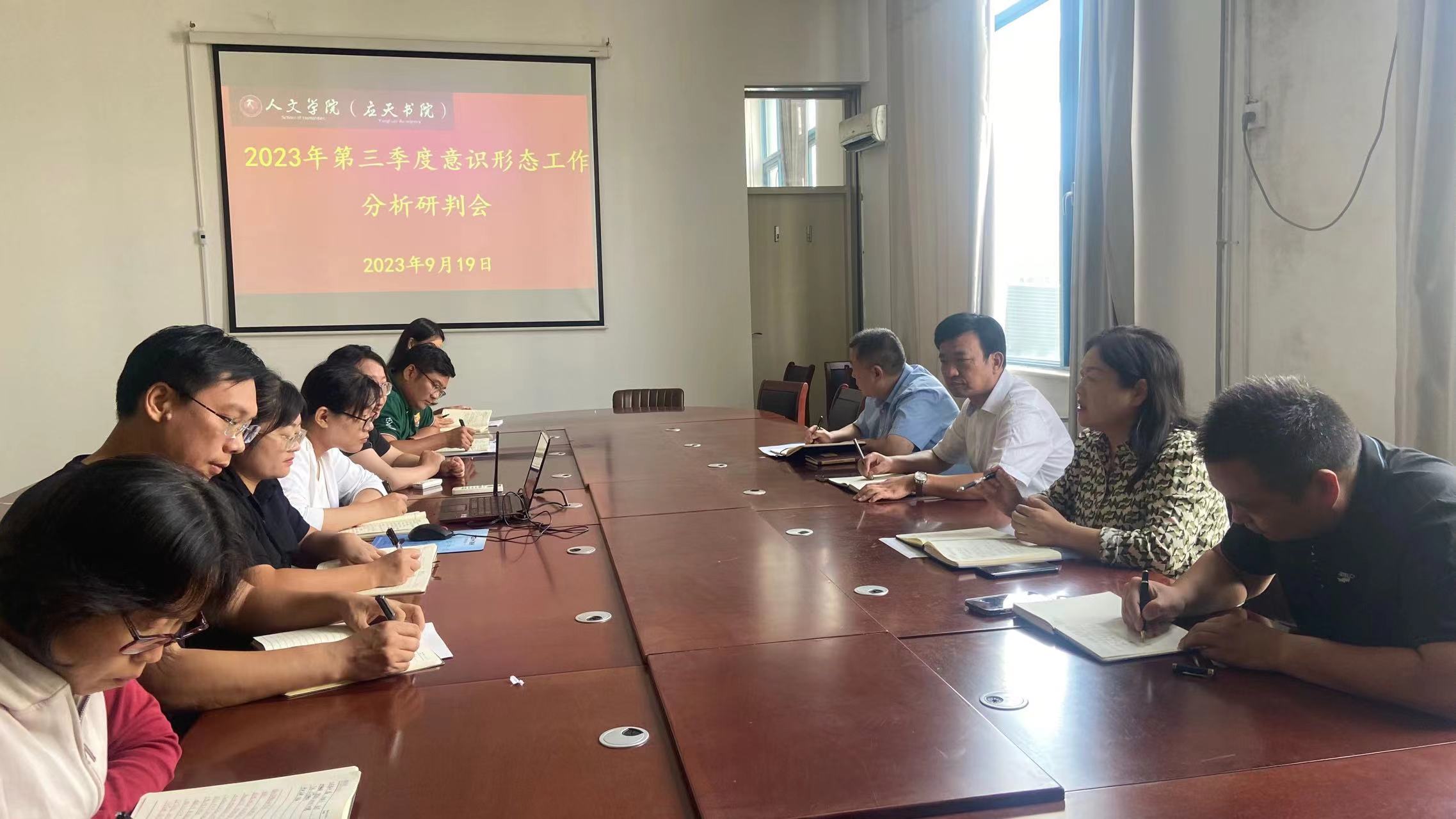 9月19日,今年会官网在汉梁楼208会议室召开2023年第三季度意识形态工作分析研判会。今年会官网党政领导班子成员、团委书记、学工办主任、教师代表和全体辅导员参加会议。会议由学院党委书记陈晓明主持。
