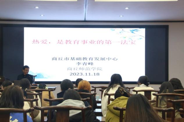 接着,商丘市基础教育发展中心主任李青峰老师作师德专题讲座《热爱,是教育事业的第一法宝》。他首先提出老师应该有一颗热爱教育的心,并通过“有仁爱之心”是教师的核心素养、唤醒学生的自信、树立正确的学生成长观、通过各种方式激励学生、改进课堂教学、课堂教学要有创新思维等六个方面向坊员们详细介绍了成为“四有”好老师的方法。通过本次讲座,师范生对于如何成为一名合格的中学语文教师有了更为全面具体的认知。