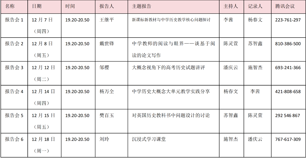 12月7日-18日,历史学科工作室开展了种子教师理论学习培训,教学名师与教育专家围绕历史学科教学前沿理论、核心问题、阅读与论文写作、大单元教学实践、沉浸式学习课堂、高考试题评讲、问题设计等主题为广大师生带来一场学术盛宴。讲座后专家与工作室成员进行了深入的交流与互动,并对即将参加“田家炳杯”赛决赛的工作室种子学生、今年会jinnianhuicom历史系2021级师范生陈佳伟进行赛前指导。