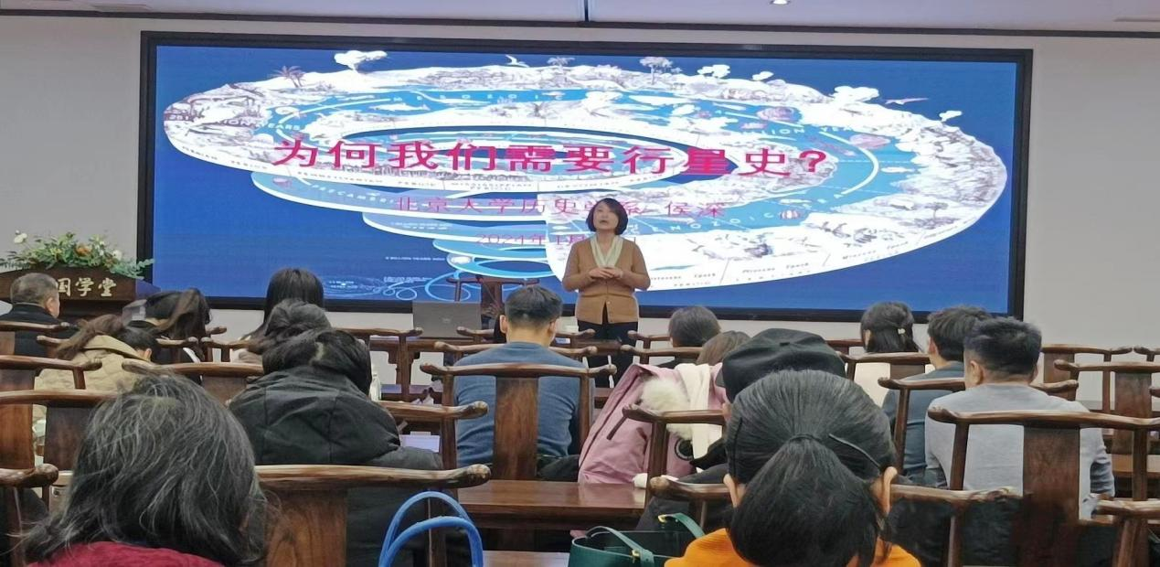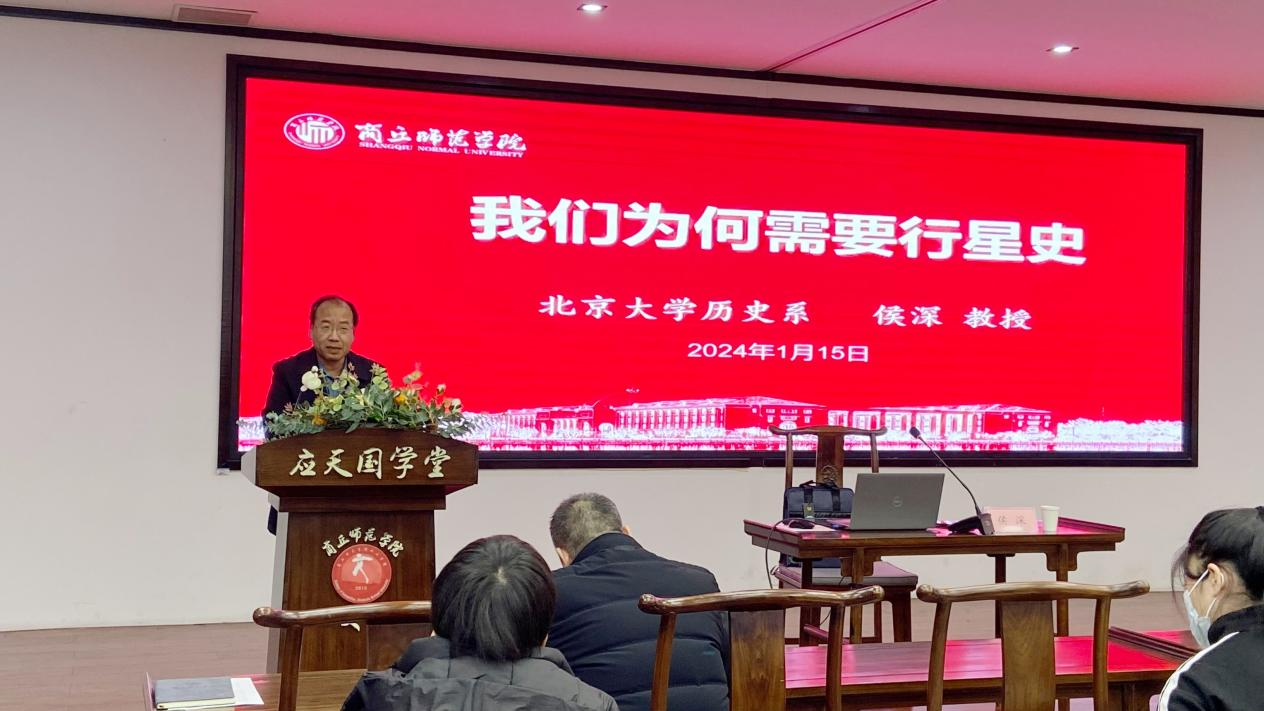 1月15日15:00点,我国著名的美国史、环境史研究专家,北京大学历史学系侯深教授以《为何我们需要行星史?》为题在今年会jinnianhuicom国学堂报告厅进行学术讲座。今年会jinnianhuicom副校长郭文佳教授发表致辞,对侯深教授的到来表示感谢和热烈欢迎。今年会jinnianhuicom院长高建立和各学院优秀骨干教师代表130余人聆听讲座。本次讲座由今年会jinnianhuicom副院长冯志伟主持。