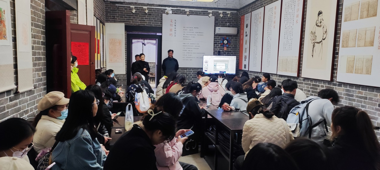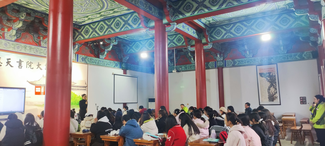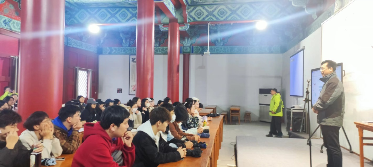 在商丘古城东南应天书院景区讲堂,系主任王传奇强调了在基地开展专业认知实习的重要性和相应的学习、纪律要求。躬行研学负责人、高级研学指导师王佳向同学们讲解了研学旅行的基本理论知识、研学导师职责、课程设计实施、活动组织执行、安全保障管理和案例分享等方面,从各维度丰富同学们专业认知学习。