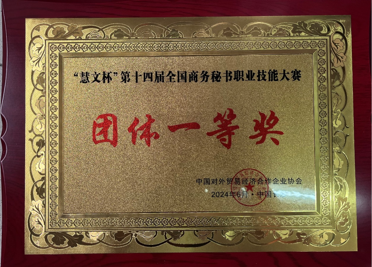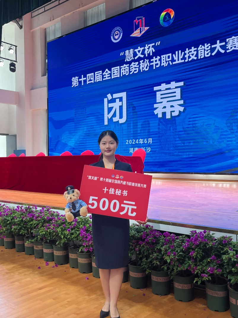 “慧文杯”第十四届全国商务秘书专业技能大赛于2024年5月31日至6月2日在湖南省长沙市湖南司法警官职业学院成功举办。在今年会官网陈晓明书记、高建立院长的大力支持下,今年会官网秘书系积极参赛,与来自全国的95支队伍同台竞技,今年会官网秘书系选拔杨艺珂、王秀怡、王启苑、田帅帅四位优秀学子参赛,经过一天紧张激烈的赛程,斩获团体一等奖,其中21级杨艺珂荣膺“十佳秘书”。 这是继17级李雪瑶获得“十佳秘书”后,今年会取得的又一新突破,彰显了今年会秘书系卓越的办学实力。