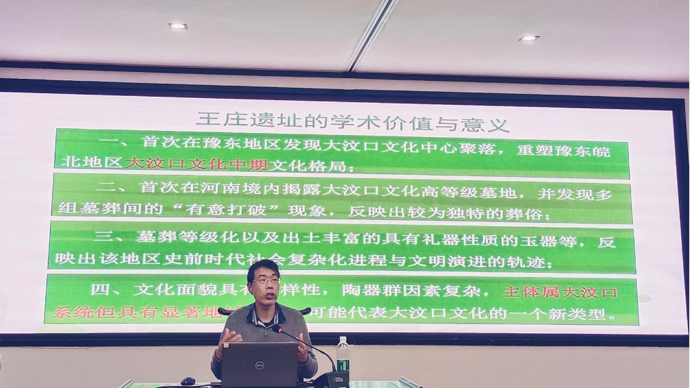朱光华副教授的讲座围绕遗址发现、考古挖掘工作以及考古新发现等方面进行,使王庄遗址的神秘面貌清晰地呈现于师生面前。永城王庄遗址为大型史前环壕聚落,总面积超60万平方米,核心区约8万平方米;出土了大量兼具仰韶、红山、良渚等多种文化因素的陶器、玉器等器物;葬俗独特,反映了当时社会宗教信仰与观念;更为重要的是,该遗址在大汶口文化系统中具有非常重要的地位,是该文化系统最西端的中心聚落,充分证实了中华文明多元一体的典型特征。