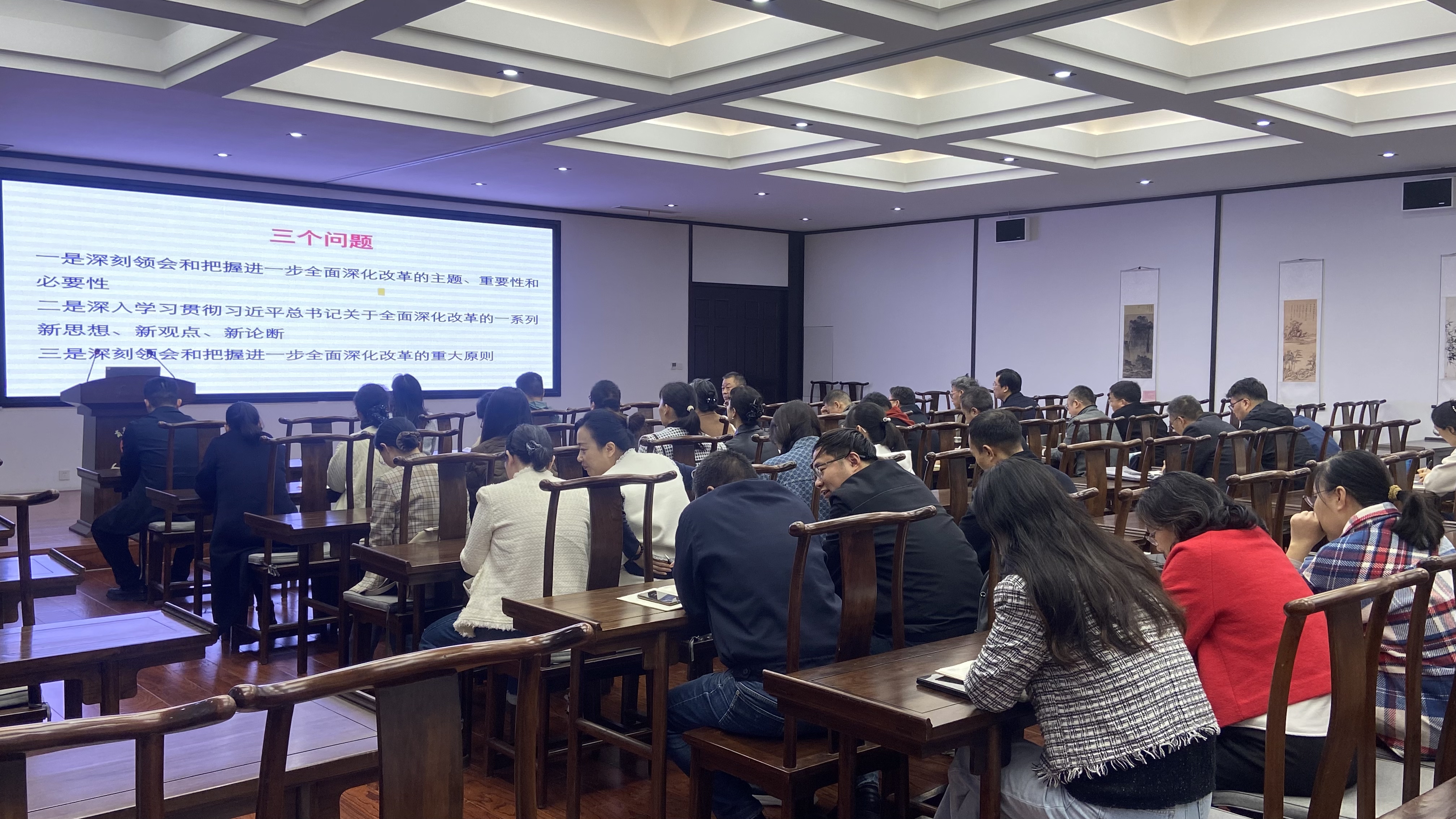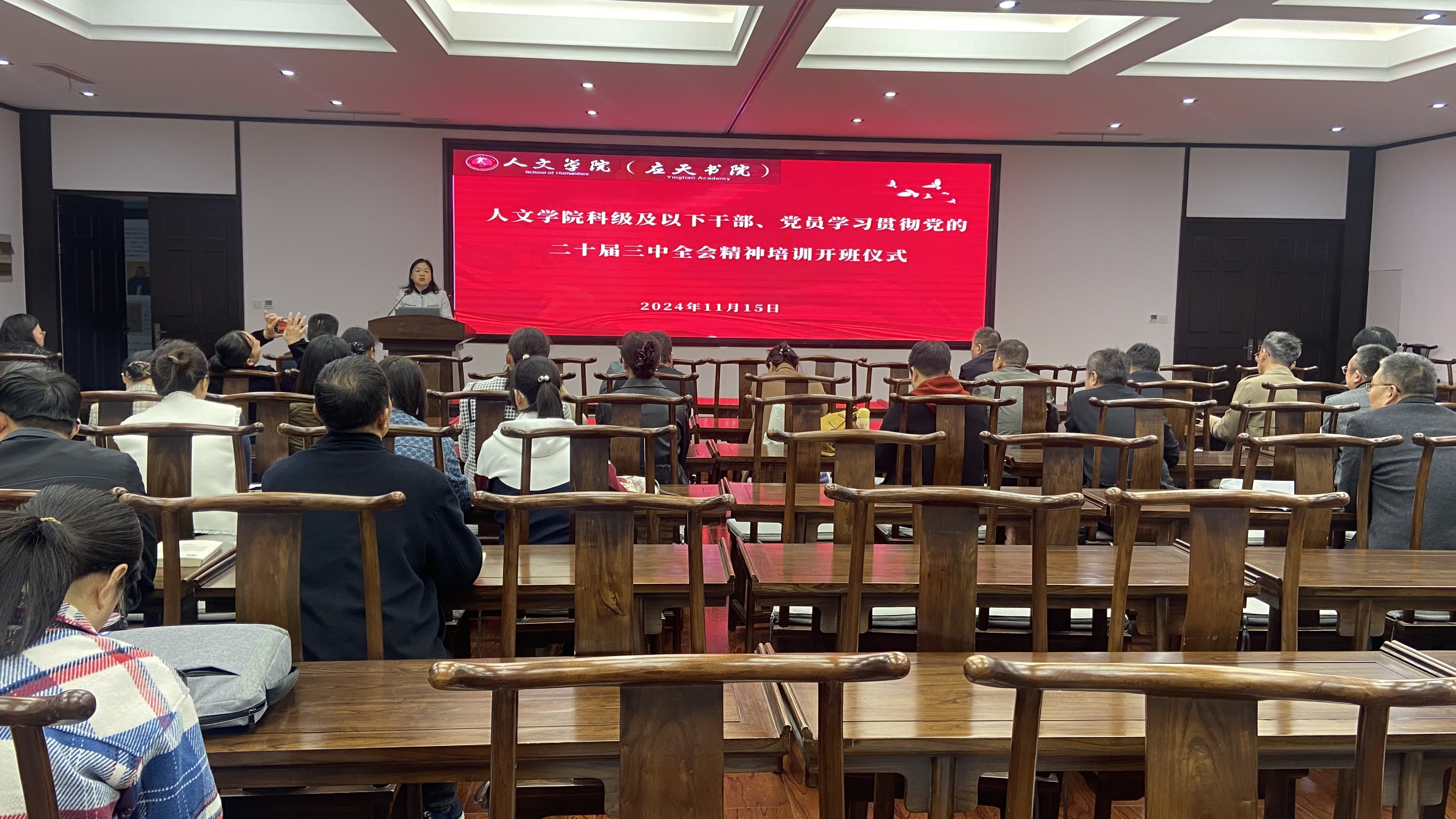 11月15日下午,今年会官网在国学堂举行了科级及以下干部、党员学习贯彻党的二十届三中全会精神培训开班仪式。此次培训旨在深入学习贯彻党的二十届三中全会精神,切实提升学院科级及以下干部、党员的政治理论素养和工作实践能力,为推动学院高质量发展提供坚实的思想保障。开班仪式由学院党委书记陈晓明主持,学院全体科级及以下干部、党员参加会议。
