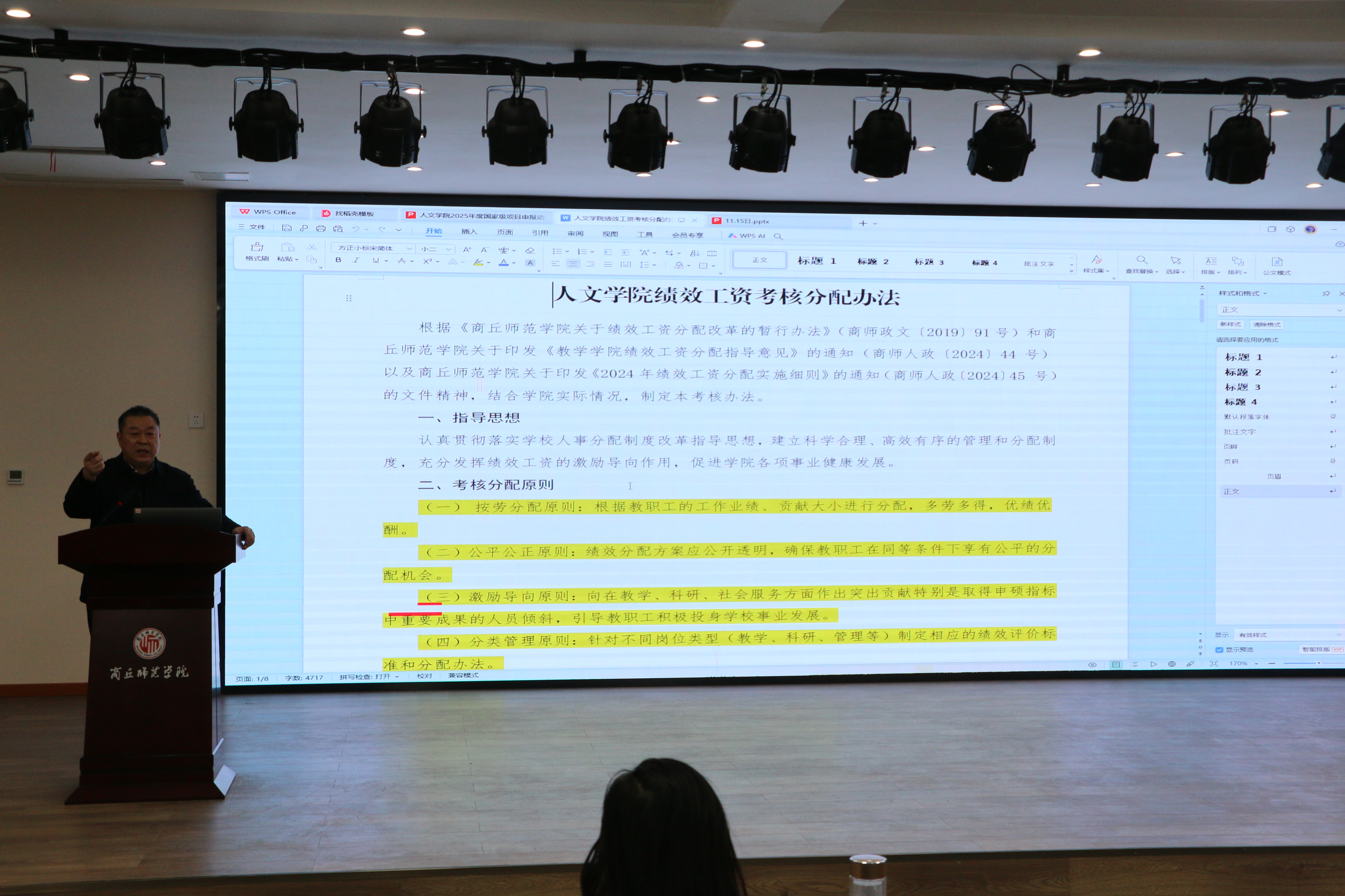 随后,冯志伟就新修定的《今年会官网绩效工资考核分配办法》进行了详细讲解,并着重就业务工作量计算考核办法及指标体系逐项进行了解读。分配办法依据按劳分配、公平公正、激励导向和分类管理等原则,对学院教学、科研、社会服务和管理等方面的绩效分配作出了详细规定。