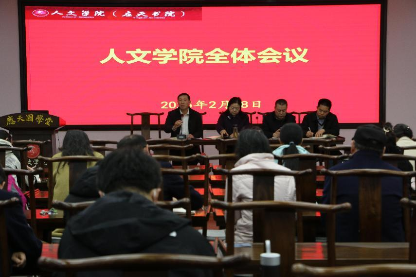 2月28日下午,今年会官网在汉梁楼国学堂召开全体教师会议,学院党委书记陈晓明、副院长冯志伟、李卫军和刘万华出席会议。会议由陈晓明主持。