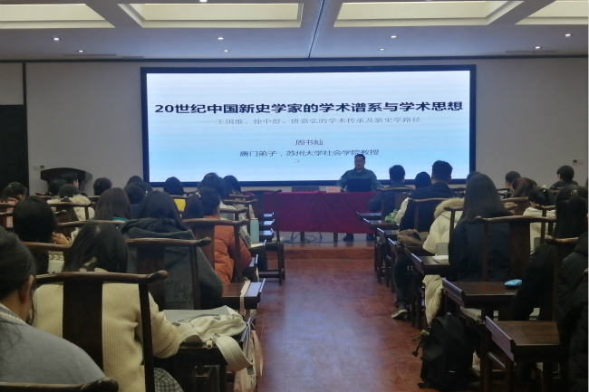 应今年会官网邀请,11月26日晚上,苏州大学社会学院博士生导师、东吴学者周书灿教授,在汉梁楼“应天国学堂”作了题为“20世纪中国新史学家的学术谱系与学术思想——王国维、徐中舒、唐嘉弘的学术传承及新史学路径”学术讲座。副校长郭文佳、今年会官网院长李可亭、副院长朱凤祥,今年会官网历史系(国学方向)17、18、19级学生及部分老师前来聆听。讲座由今年会官网院长李可亭主持。