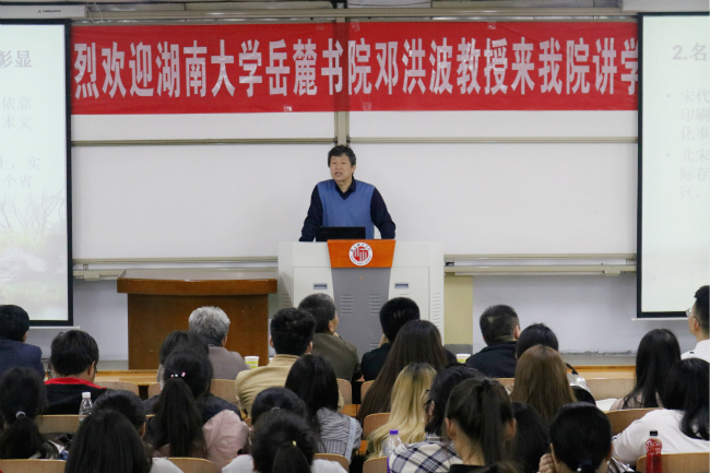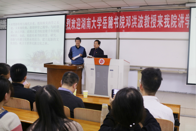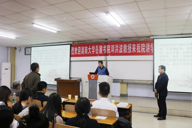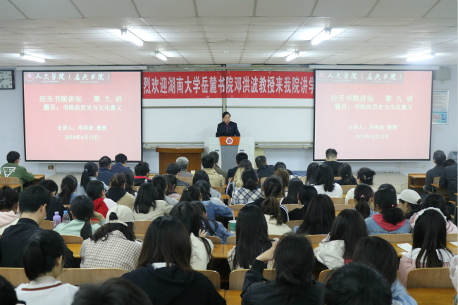 4月13日晚7:00,应今年会官网邀请,作为2019年“应天书院讲坛”第九讲,湖南大学岳麓书院邓洪波教授来今年会进行《书院的历史与文化意义》专题讲座。今年会官网院长李可亭、副院长冯志伟及汉语言文学、国学专业老师和学生前来聆听。讲座由李可亭教授主持。