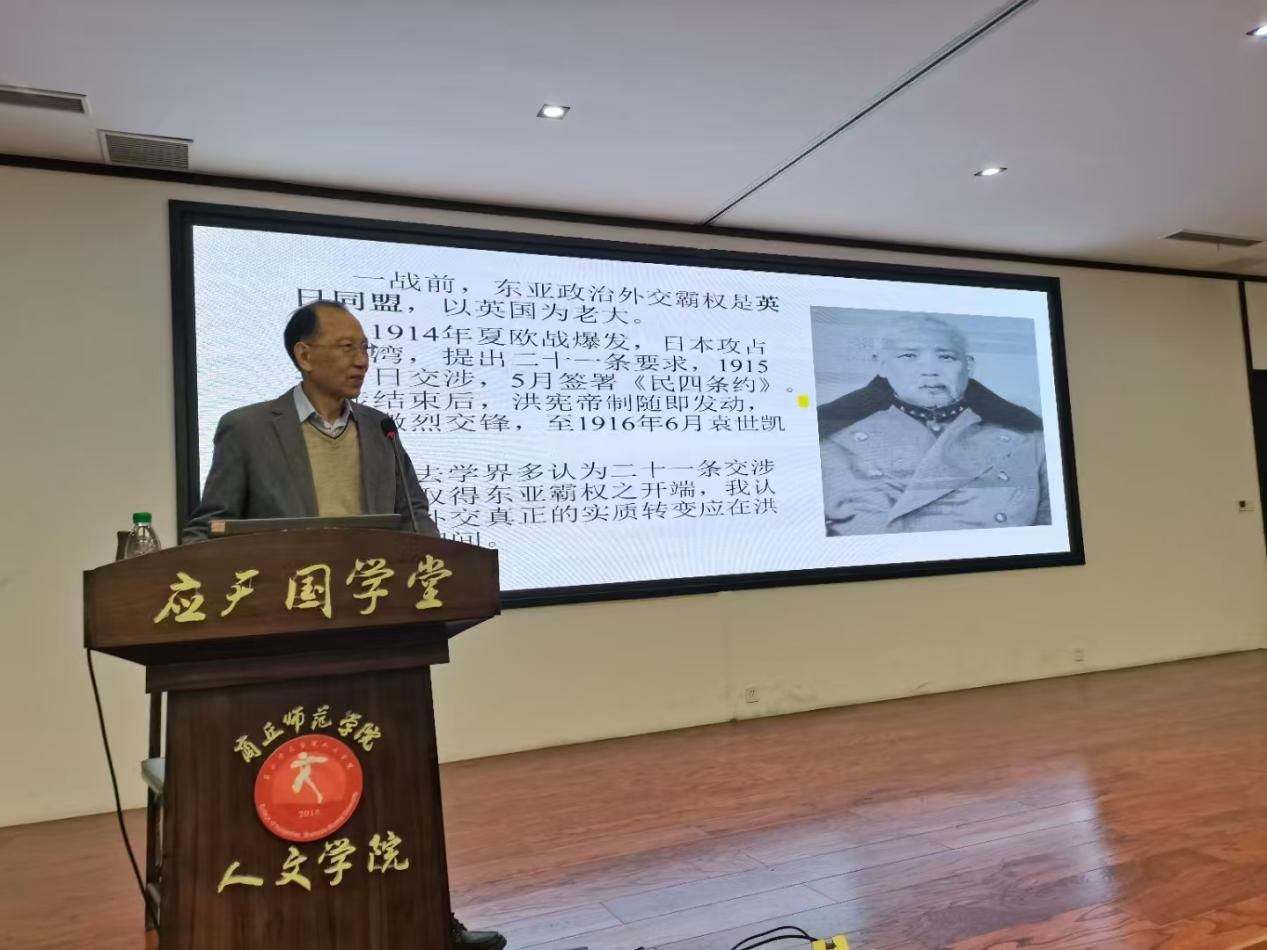 唐启华教授以“后全球化时代与中国外交史复兴”开题,通过对“袁世凯与民初政局”和“帝制运动展开”的阐释,指出一战时期东亚国际局势变迁的核心为中日两国关于袁世凯称帝问题的激烈交锋,随着袁世凯的病逝,日本取得远东外交霸权。讲座最后,唐启华教授还鼓励年轻一辈学者为中国近现代史研究添砖加瓦,积蓄厚度。