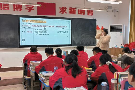 随后高永老师带领坊员观摩示范课。第一节示范课为王老师所授的《边疆危机与甲午中日战争》这一子目。在课程讲述中,王老师运用表格对比、地图展示和材料分析等多种教学方法引导学生思考教学内容,同时将知识点融会贯通,结合前课内容,完整且流利地讲述了本课的内容。王老师的课中强调了“时空观念”的重要性,培养了学生梳理历史时间和事件的能力。第二节示范课是由孙老师讲述的选修课中的《现代食物的生产与储存》。孙老师十分注重与课本知识相连接,时刻提醒学生注意课本内容,同时引导学生自主思考,拓展思维,思考粮食生产储存条件,深刻理解课本知识。孙老师还善于串联知识点,例如在讲解现代生产技术使得粮食增产这一知识时,孙老师串联起精耕细作这一知识点来突出现代生产技术。最后,孙老师运用思考题引导学生自主思考,分析原因和应对措施。孙老师结合课本知识和课外拓展,引导学生自主思考,提高了学生的自主思考能力和知识整合能力。