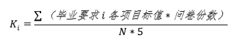调查问卷中,对应于每个毕业要求的评价分为“完全达成、较好达成、基本达成、部分未达成、完全未达成”五个等级。调查结束后,由专业毕业要求达成度评价小组对收到的所有调查问卷进行量化统计计算,其中,五个等级分别对应于“5、4、3、2、1”五个分值,得到应届毕业生对各个毕业要求的达成度评价值。毕业要求间接评价的计算公式为: