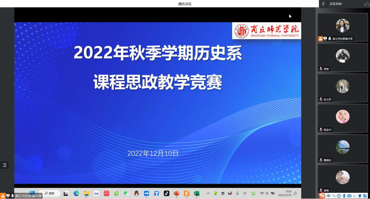 2022年12月10日下午,历史系在线上举办2022年秋季学期课程思政教学竞赛。历史学专业全体任课教师参与,历史系主任薛立芳主持。